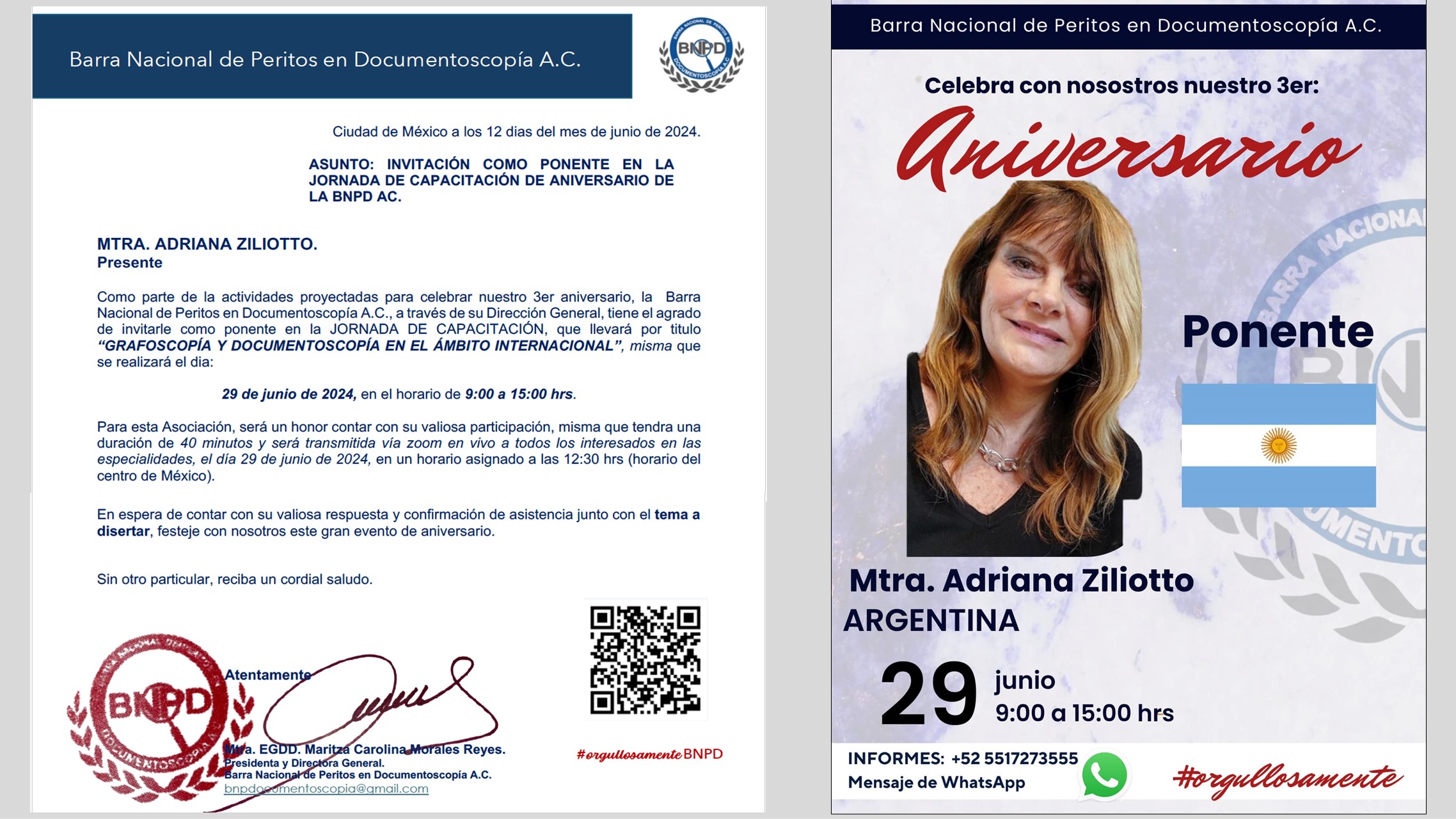 Con motivo del tercer aniversario de la Barra Nacional de Peritos en Documntoscopía de México, entidad presidida por la Doctora Maritza Carolina Morales Reyes, se ofrecerán una serie de ponencias a cargo de sus Mienbros Honoríficos. Dentro del programa se ofrecerá un Conversatorio sobre «Nuevas Tecnologías» conducido por la Presidenta, en el que se reunirán Gabriela Hernández, presidenta de SIPDO Argentina, Liliana Soria y Adriana Zilotto, integrantes también de la Comisión Directiva del mencionado Capítulo.