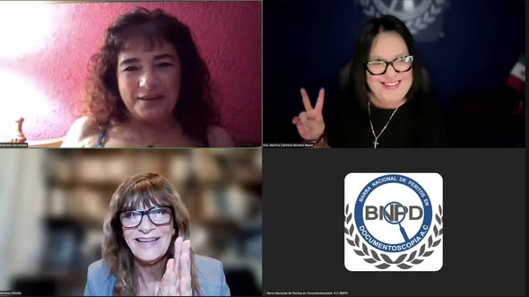 El viernes 6 de marzo a las 17 hs de México / 20 hs de Argentina, la Dra Maritza Carolina Morales Reyes, Fundadora de la Barra Nacional de Peritos en Documentoscopía de México coordinó una charla on line con tres colegas argentinas expertas en escritura como la Lic. Gabriela Hernández, vicepresidenta de la Barra Internacional, la Perito Calígrafa Liliana Soria y la Lic. Adriana Ziliotto.