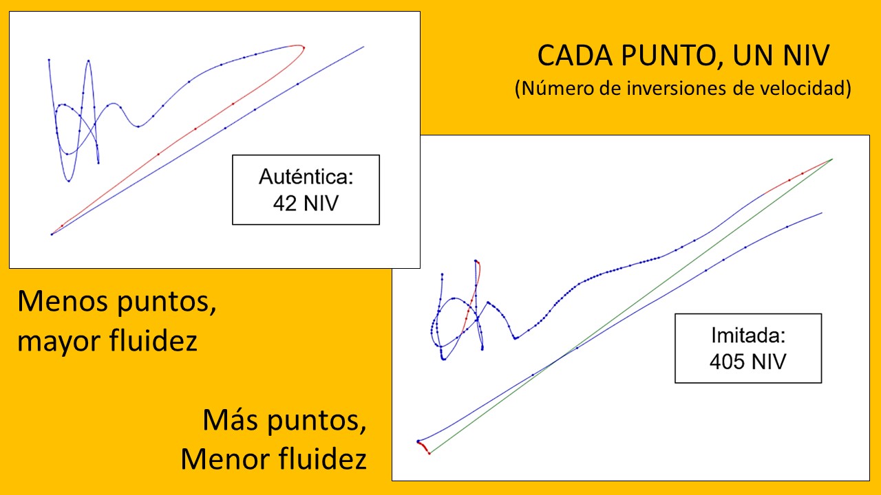 Pero además de “verse”, las fluctuaciones también se pueden contar como unidades o puntos que objetivan el número de inversiones de velocidad (NIV). Los gráficos de barra los muestran tanto en las fases físicas como en las aéreas y, al mismo tiempo, en la tabla de datos se resaltan los totales: 42 NIV para la firma auténtica y 405 NIV para la imitación, lo que arroja una diferencia porcentual del 864,29, cifra que refleja la gran diferencia de fluidez entre ambas.